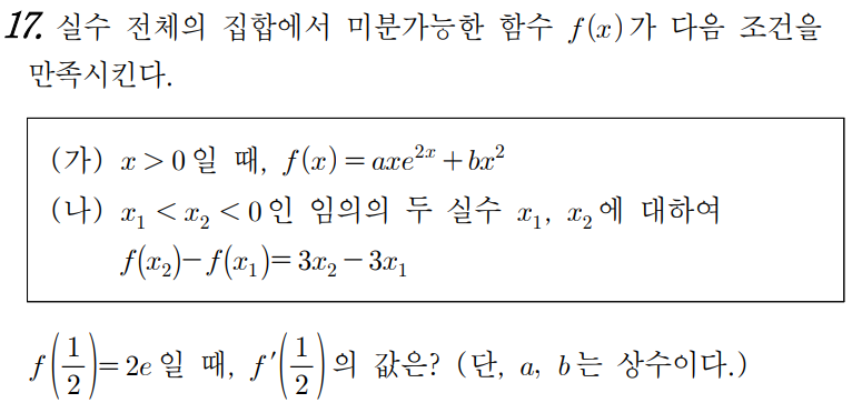 출제자는 미분가능성을 이용해 미지의 상수들을 추론하기를 기대했으나, 마침 문제 마지막 줄에 주어진 함숫값에 4를 곱하면, a와 b를 몰라도, 구하라는 미분계수의 값이 되는 구조여서, 이 땅굴을 발견했던 수험생들은 말 그대로 무혈입성.